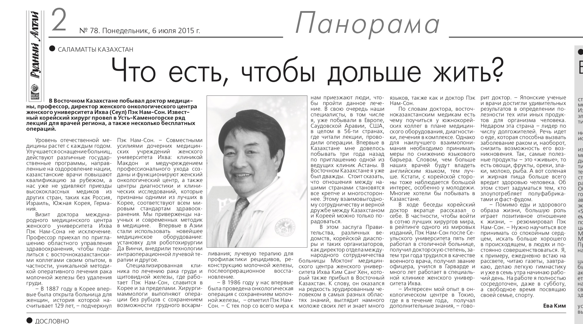 July 2016. In July 2016, an appointment was made to the doctor of medicine, professor, director of the oncological center of the Ewha Women's University (Seoul) Pyak Nam Son in the East Kazakhstan Region. The famous Korean surgeon held a series of lectures for doctors in the region in Ust-Kamenogorsk and several free surgeries.